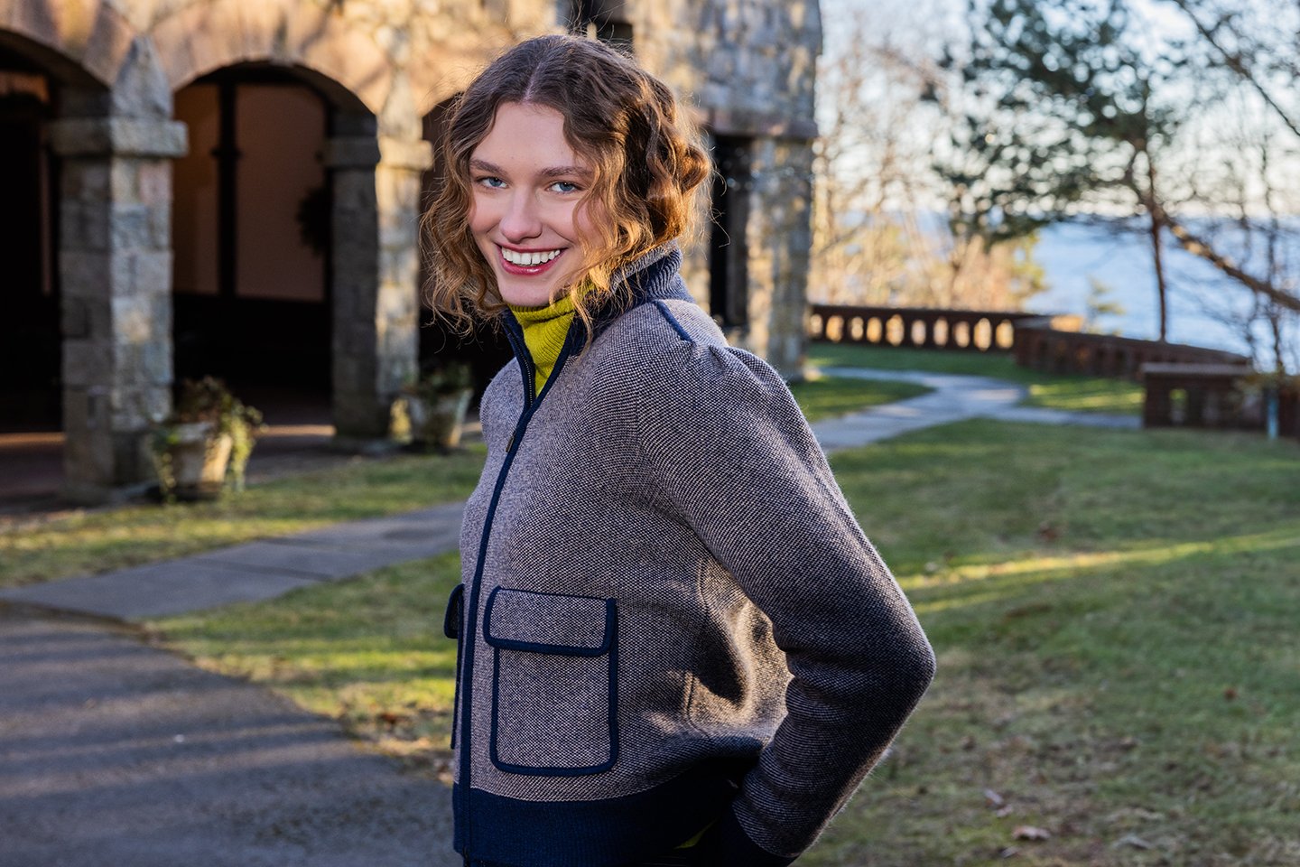 In this story we feature our more urban and contemporary color palette accented by cordovan, a trendy upscale hue. Sculptural modern forms take shape. Tailored cardigans and blazers add edge. Clean flat surfaces juxtapose ribbed and cabled textures. Wovens and knits mingle in innovative ways. Look effortlessly cool as you peruse the high-end shops decked out in your own high street fashion.
