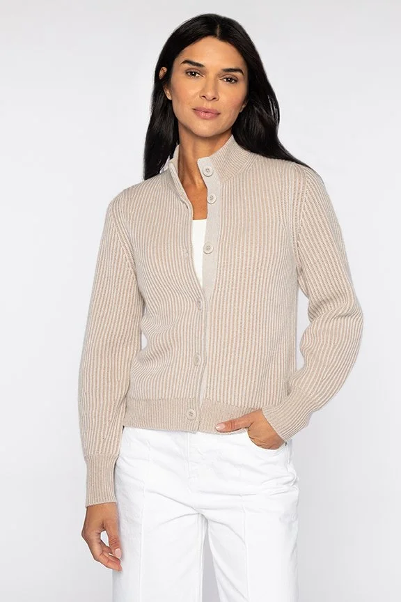Trending highly this season are the longer woven topper and bomber silhouettes. Rib details play a role in updating our double-knit offerings, including the blazer. And utility cardigans and shackets continue in their dominance.