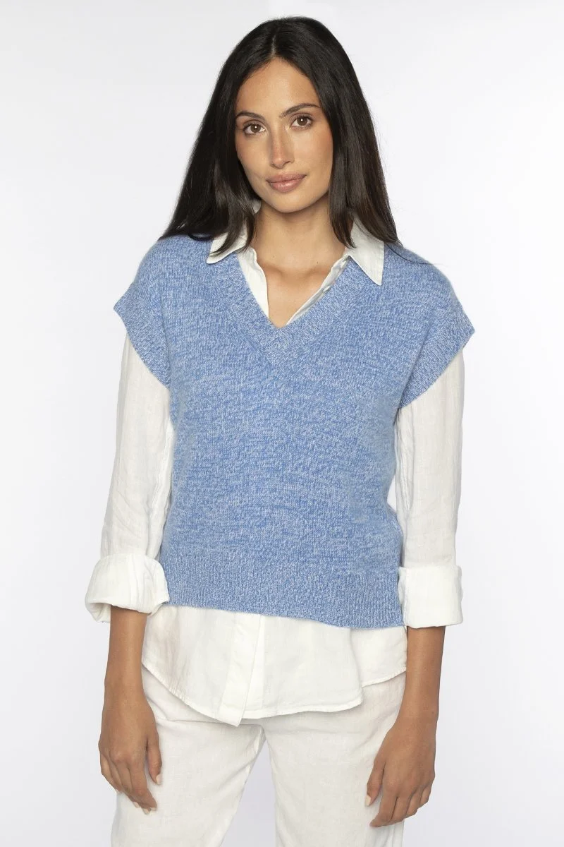 An open textured sweater or vest allows a bright white shirt to pop through.